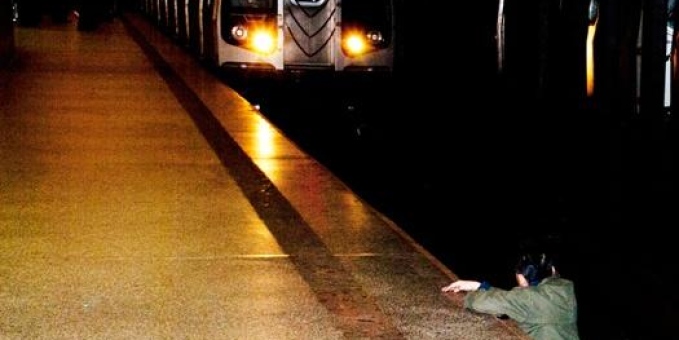 El hombre que aparece en la fotografía aferrado al muro al que no pudo subir, ve horrorizado la unidad del Metro que se acerca y que lo arrollará quitándole la vida.