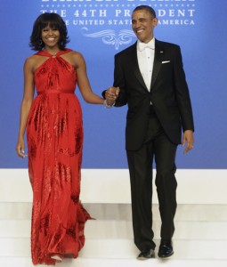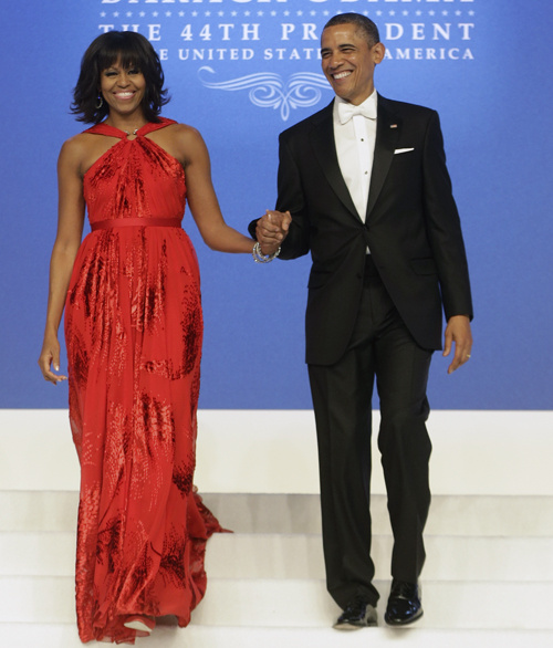 Durante la toma de posesión del Presidente estadounidense Sr. Barack Obama, que se celebró en el Centro de Convenciones de Washington. La Primera Dama de EE.UU. Sra. Michelle Obama eligió para la ocasión un vestido de terciopelo rojo del diseñador taiwanés Jason Wu.