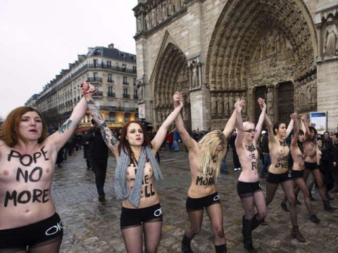 Un grupo feminista se paseó con los senos desnudos este martes en catedral de Notre Dame de París, festejando la renuncia del Papa Benedicto XVI.
