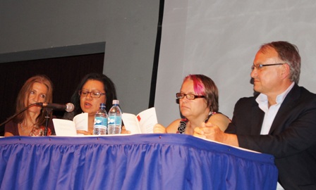 Marta Leonor González, con el embajador de Francia en Nicaragua Antoine Joly, la escritora rusa Helena Ramos, y la traductora Michelle Dospital.