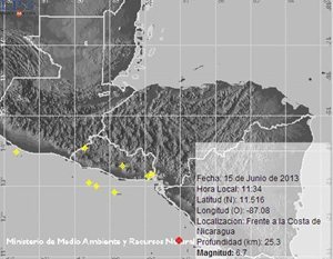 Un sismo de 6.7 grados en la escala Richter fue registrado este lunes a las 11:34 de la mañana frente a las costas de Nicaragua, a unas profundidad de 25.3 kilómetros, según reporte del Ministerio de Medio Ambiente y Recursos Naturales de El Salvador.