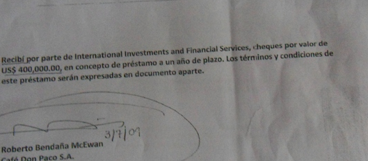 Documento en el que Roberto Bendaña acusa préstamo de 400 mil dólares del dinero de las monjitas Teresianas.