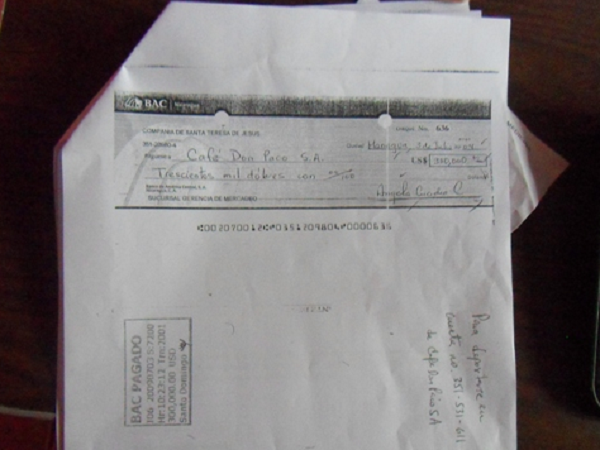 Cheque por 300 mil dólares librado por las monjitas Teresianas a nombre de Café Don Paco, del que Roberto Bendaña es presidente.