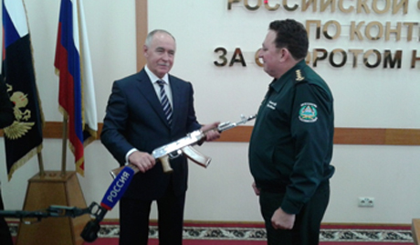 La famosa arma, de la que se han vendido más de 100 millones en el mundo y es el fusil oficial en 55 países, incluyendo a Nicaragua, le fue entregada por Víctor Ivanov, director del Servicio Federal Ruso de Control de Drogas (FSKN), según publicación de La Voz de Rusia.