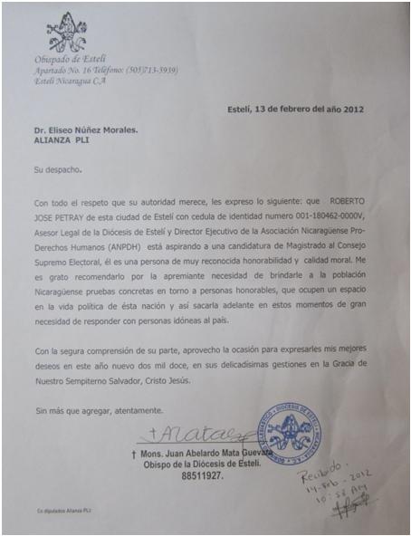 “Con todo el respeto que su autoridad merece, le expreso lo siguiente: que Roberto José Petray, de esta ciudad de Estelí con cédula de identidad número 001-180462-0000V, Asesor Legal de la Diócesis de Estelí y Director Ejecutivo de la Asociación Nicaragüense Pro Derechos Humanos (Anpdh), está aspirando a una magistratura al Consejo Supremo Electoral…