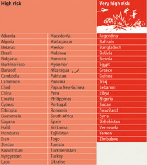 El Medio Oriente y África del Norte (MENA), el sur de Europa, los Balcanes y los países ex soviéticos de la Comunidad de Estados Independientes (CEI) están bien representados en las categorías de alto riesgo: