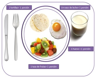 En la imagen adjuntase muestra un plato de desayuno. En él se especifica cuánto es una porción de cada alimento. Por ejemplo, un vaso de leche corresponde a una porción de lácteo. Una porción de carne corresponde a un huevo completo. Así como dos tortillas medianas y delgadas corresponden a una porción de harina, y una taza de fruta también representa una porción.