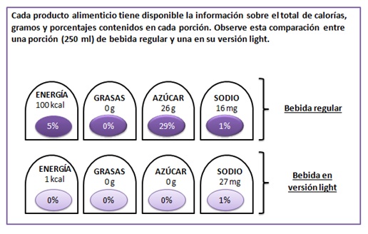 En este ejemplo podrá observar una GDA con los porcentajes de contenidos en las presentaciones regulares y light de una gaseosa de 250 ml (esto equivale a una porción). El consumidor tiene la opción de escoger entre cualquiera de las dos pues ambas hidratan, sólo se guiará por la que tenga los porcentajes más acordes a los que su médico o nutricionista le indicó. En este caso, una gaseosa de 250 ml aporta 100 calorías en la versión regular y una en la versión light.