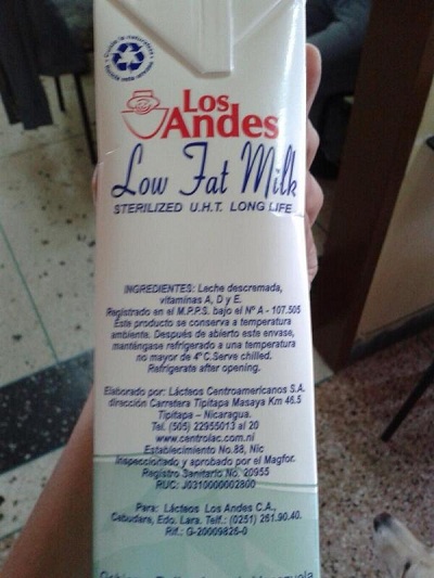 En el envase se lee que la leche es envasada para Lácteos Los Andes C.A., Cabudara, Estado de Lara. Además se especifica que es baja en grasa y que el envase es del tipo U.H.T. de larga vida.