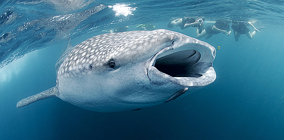 El tiburón ballena puede crecer hasta 12,6 metros de largo y pesar hasta 21,5 toneladas métricas. Sin embargo, es un gigante lento que se alimentan de algas, plancton, krill y larvas de cangrejo, y es vulnerable a la embestida de naves.
