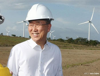 El martes, Ban visitó un parque eólico en la zona de Rivas, a unos 100 kilómetros al sur de Managua, que ha incrementado su generación por la fuerza de los vientos en estos meses.