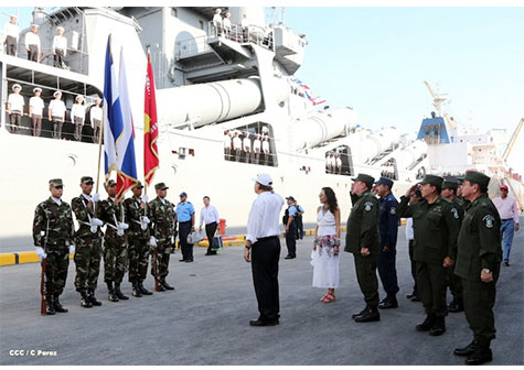 El crucero de misiles Moskvá cuando era despedido por el presidente Daniel Ortega y autoridades militares.
