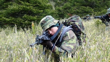 Según Hsieh, no existen diferencias entre hombres y mujeres en el combate, así que los soldados en entrenamiento deben experimentar los mismos ejercicios, sin importar su género. En la gráfica, Hsieh participa en un ejercicio táctico.