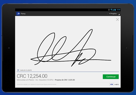 El proceso de uso de MiPOS es fácil, rápido y seguro. La aplicación permite que el tarjetahabiente firme en la pantalla táctil del dispositivo y decida con qué moneda pagar, sea local o dólar estadounidense.