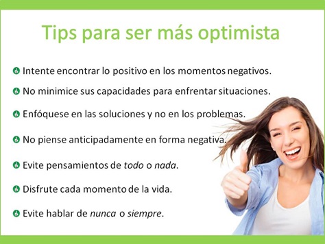 La nutricionista, Consuelo Pardo, menciona: “Las personas optimistas son aquellas que tienen una visión positiva en los malos momentos. Se caracterizan por vivir el presente y no preocuparse por el futuro, son atentos con las personas que los rodean, perseverantes, además de ser prácticos y realistas, en especial con relación al cuidado de sí mismo, como es el efecto del acto de alimentarse”.