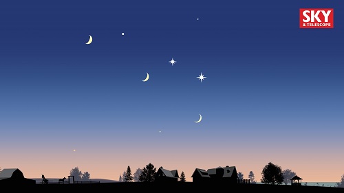 Un poco más abajo del par de planetas la delgada Luna creciente se mostrará gloriosa, pero lo más importante se producirá este sábado 20, cuando la dama de la noche se ubique justo a la izquierda del dúo planetario, formando un triángulo que sin duda llamará la atención.