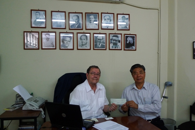 El encargado de negocios de la embajada de Taiwán, Sr. James Lee, entrega la donación al poeta Francisco de Asís Fernández.