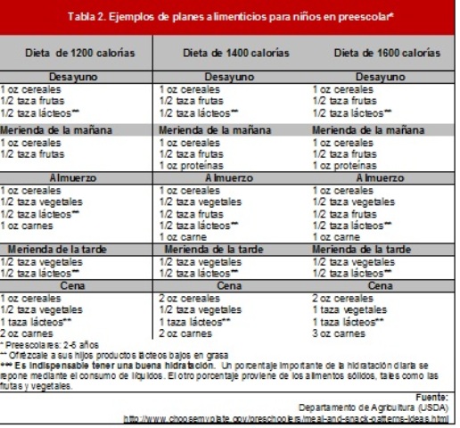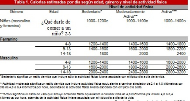 De acuerdo con esta Guía, un niño moderadamente activo, de 4 a 8 años, podría requerir entre 1400 a 1600 calorías al día. El rango para los niños mayores y adolescentes también puede variar considerablemente. Por ejemplo, un niño activo que realiza mucho ejercicio, entre las edades de 9 a 13 años, podría necesitar entre 1800 a 2200 calorías diarias (Ver Tabla 1). Sin embargo, advierten que estas son solamente estimaciones y recomiendan siempre calcular las necesidades de cada niño individualmente.