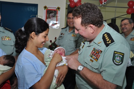 El jefe del Ejército de Nicaragua, General de Ejército Julio César Avilés Castillo y la licenciada Conchamarenco Salinas, Presidenta Honoraria de la Asociación Esposas de Militares del Ejército de Nicaragua (Aemen), visitaron este 30 de Mayo, Día de las Madres, a las mujeres que dieron a luz en el Hospital Escuela “Alejandro Dávila Bolaños”.